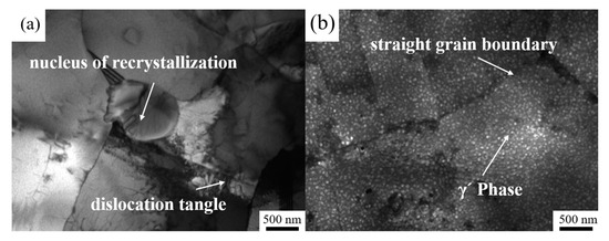 Figure 16 is a TEM image of region A before and after over-solution treatment under the thermal deformation conditions #1020-1-10, and the location of region A is shown in Figure 13b. After thermal deformation, the dislocations in region A are entangled and a small number of recrystallized nuclei are formed at the grain boundaries. After over-solution treatment, the recrystallized grains in this region grew significantly, the grain boundaries became straight, the dislocations were annihilated, and a large number of spherical γ′ phases are evenly precipitated in the grain boundaries. This shows that the stored energy after thermal deformation is consumed in the A region during the over-solution treatment, and the small amount of recrystallized grains formed further consume the stored energy and interface energy of deformation and eventually develop into ALGs. The experimental results are consistent with those of the CA.