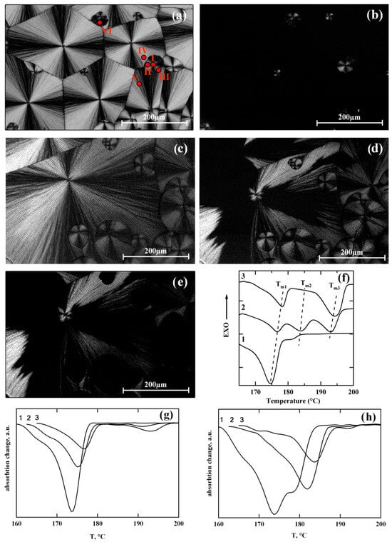 As evidenced by DSC data, recrystallization processes do not play a significant role during heating after crystallization at temperatures above 160 °C. Therefore, any decrease in optical density in a selected region is attributed to the melting of specific crystal modifications. Figure 1g,h display the derivative of optical density as a function of temperature for Samples 1, 2 and 3, measured in the α-spherulites and mixed spherulites, respectively.