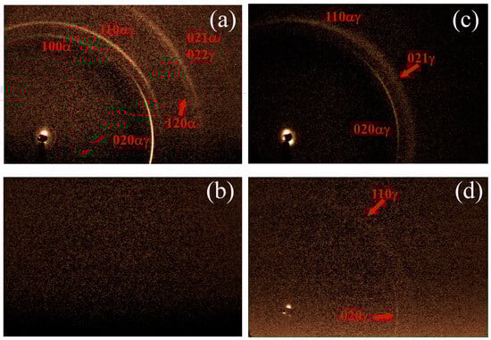 Region V (Figure 6c) exhibits the 100α (4.98 Å) and 120α (3.48 Å) reflections, which are characteristic of the α-phase, and the absence of the 021γ peak. The azimuthal position of the 020α reflection aligns with the radial direction of the banded spherulite (dashed arrow in Figure 6b,c), indicating that the growth direction of the α-spherulite is parallel to the b-axis of the α unit cell.