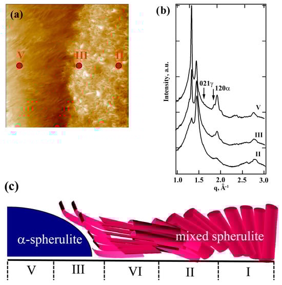 (a) AFM scan (10 × 10 µm2) highlighting the boundary between α- and mixed spherulites (region III); (b) 1D WAXS profiles corresponding to regions II, III and V, respectively; (c) schematic representation of the mixed spherulite morphology, with Roman numerals indicating the corresponding regions identified in the POM image.