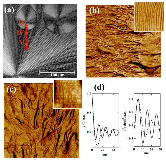 The microstructure of the samples was analyzed using AFM. Scanning the mixed spherulite in Sample 1, which exhibits low birefringence at its periphery, revealed a complex morphology (Figure 3a). The topography image shows that the center of the spherulite (region I) is composed of curled, cylinder-like entities with diameters ranging from 300 to 600 nm (Figure 3b). Similar lamellar scrolls have been reported in PVDF films crystallized above 168 °C [59]. Moving radially outward from the center (region I) to the intermediate region (region II), the orientation of the scroll axes transitions from perpendicular to the film surface to inclined along the radial direction (Figure 3c). In contrast, at the low-birefringence region (region VI), flat-on lamellae with slightly curled edges along the tangential axis are observed, alongside bright, out-of-plane banded lamellae (Figure 3d).