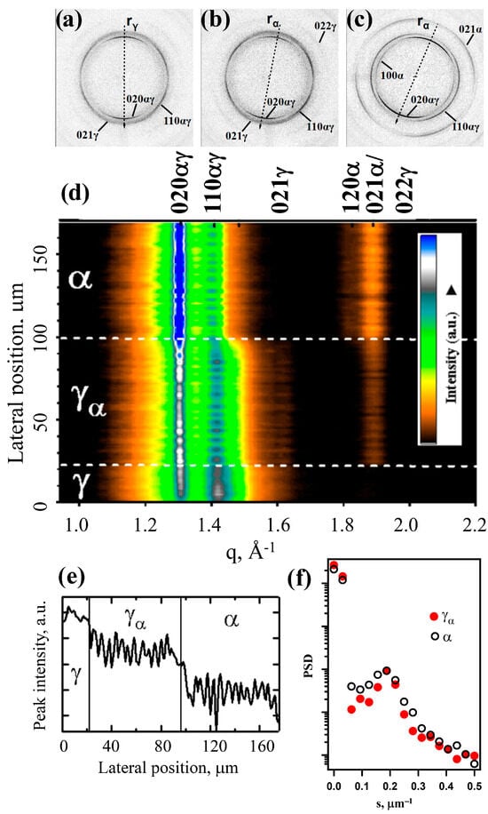 The radially integrated diffraction intensity, plotted as a function of scan distance (axis y) and reciprocal-space vector q (axis x), is shown in Figure 6d. Oscillations in the intensity of the 110αγ reflection within the γα- and α-regions exhibit a periodicity of approximately 5 µm, corresponding to the banding periodicity (Figure 6e,f). This intensity variation can be attributed to regular lamellar twisting, which causes the lamellae to move in and out of reflection conditions during the scan. The discrepancy between the banding period obtained from microfocus WAXS and POM may arise from slight deviations in the scan direction from the exact radial orientation.