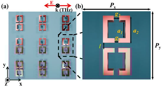 The proposed metasurface structure consists of a periodically arranged aluminum double split-rectangular resonator (DSRR) array on a SiO2 substrate, as shown in Figure 1a. Figure 1b presents the top view (x-y plane) of the DSRR: the periodic constants in the x and y directions are Px = Py = 100 μm; the side lengths of the outer and inner rectangular shapes of the DSRR are a1 = 20 μm and a2 = 30 μm, respectively; the widths of the upper and lower gaps of the rectangular body in the DSRR are g2 = 4–10 μm and g1 = 4 μm, respectively; the distance between the two rectangular bodies is t = 6 μm and the height of the rectangular bodies is h = 8 μm; here, the asymmetry parameter α is defined as ; the DSRR is built on a SiO2 substrate with a thickness of 100 μm and a refractive index of n = 1.54 [60,61,62]. The DSRR is made of aluminum (Al) and the conductivity of Al is 3.56 × 107 [23].