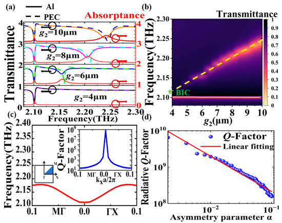 Figure 2a depicts the simulated spectra of the DSRR composed of a perfect electric conductor (PEC) and a realistic metal (aluminum) with different g2; the simulation of the PEC represents the ideal simulation of a metal with no loss in THz waves. As shown in Table 1 and Figure 2a, when g2 is varied from 4 to 10 μm, it can be observed that the Fano resonance gradually strengthens within the structure, and the transmission curve shows a typical Fano resonance curve, and the absorption of the DSRR gradually increases; when g2 = 4 μm, the Fano resonance half-peak full width (FWHM) of the DSRR structure at 2.11–2.15 THz disappears, and the corresponding absorption also tends to a smooth curve, it means a transform in radiation dipole modes in the DSRR. The mode at 2.1 THz is a weakly coupled mode of Fano resonance [8]. Figure 2b shows the two-dimensional transmission spectrum in different g2, and it can be easily observed that Fano resonance FWHM gradually decreases and disappears at 2.112 THz (marked by the green star).