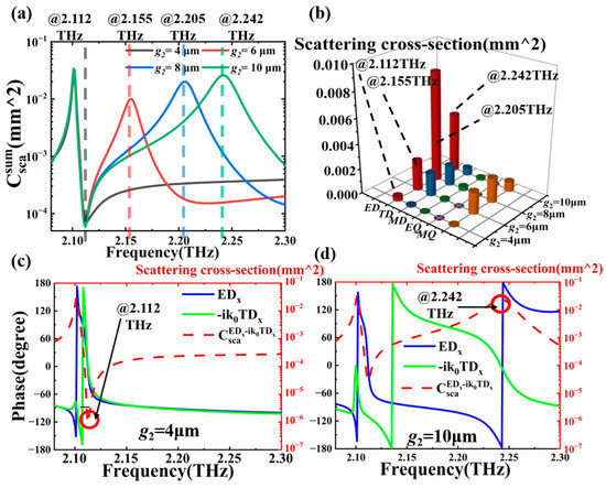 To investigate the reason for the increase in absorption within the DSRR, we performed a multipole decomposition in the Cartesian coordinate system. For specific calculations, please refer to the theoretical discussion mentioned earlier. Figure 3a depicts the total scattering power in different g2. It is worth noting that the minimum total scattering rate is at the BIC mode position (at 2.112 THz), while the maximum total scattering rate is at the quasi-BIC position. Figure 3b illustrates the composition of dipoles at the positions of the extremum, corresponding to Figure 3a. For BICs, it can be observed clearly that the contribution of the ED (at 2.112 THz) is dominant, indicating that BICs are primarily induced by the ED. For quasi-BICs, the scattering is mainly contributed by the superposition of other dipole powers. By decomposing the x and y components of the ED and TD scattering powers in Figure 3a, we find that the x component of the scattering power from the ED and TD predominates and their values are nearly equal. The y and z components of scattering power from the ED and TD approach zero when compared to the x component. This indicates that the ED and TD are aligned along the x direction when the metasurface is illuminated by x-polarized light. For the BIC mode, Figure 3a shows that the total scattering power at 2.112 THz reaches a minimum value, indicating the presence of interference and the cancellation behavior of dipoles. On the contrary, for the quasi-BIC mode, the total scattering power is at a maximum, indicating the presence of dipole superposition behavior. To verify the proposed interference cancellation and superposition mechanisms, we plotted the scattering patterns between EDx and TDx, as well as the scattering power maps of ED-ik0TD at g2 = 4 μm and g2 = 10 μm, respectively, as shown in Figure 3c,d. The blue and green lines represent EDx and −ik0TDx, respectively. When these two lines intersect, it indicates that the angular difference between their directions is π, reflecting opposite orientations and the cancellation of dipole interference. When these two lines do not intersect and differ by an angle of π, it indicates that the directional difference between them is 0, meaning they are aligned in the same direction, which leads to dipole superposition behavior. The red dashed line represents the total radiated power between EDx and TDx. When there is a minimum value of the scattering power, it indicates the interference and cancellation behavior between the EDx and TDx. Conversely, when there is a maximum value of the scattering power, it signifies the superposition behavior of EDx and TDx. This observation is consistent with the solid blue and green lines. For the BIC mode (at g2 = 4 μm), the blue and green lines intersect at the 2.112 THz, while the red dashed line shows a minimum value at 2.112 THz (see Figure 3c). This clearly indicates that the direction of EDx and TDx are opposite, demonstrating that ED and TD undergo interference cancellation behavior. Thus, the generation of the BIC mode at this location arises from the interference cancellation behavior of the ED and TD. For the quasi-BIC mode (at g2 = 10 μm), the difference in value between the blue and green lines at 2.242 THz is π, while the red dashed line exhibits a maximum value at 2.242 THz (see Figure 3d). This clearly indicates that the direction of EDx and TDx are aligned, demonstrating that the ED and TD undergo superposition behavior. Thus, the generation of the quasi-BIC mode at this location arises from the superposition behavior of the ED and TD.