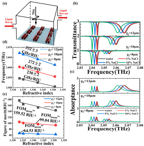 The Fano resonance characteristics of metasurfaces are influenced by the surrounding background medium, making them promising for liquid sensing applications [65]. We designed a metasurface liquid sensor featuring Al cuboid dimer clusters, a SiO2 substrate, and an integrated microfluidic channel, as shown in Figure 5a. The sensitivity (S) is defined as the resonant frequency shift per unit refractive index change, using the formula [66], where represents the resonance peak frequency shift and is the refractive index change of the analyte liquid. The figure of merit (FOM) is defined as FOM = S/FWHM, where FWHM is the full width at half maximum. As shown in Figure 5b,c, increasing the refractive index of liquid from 1.3333 to 1.351 results in a redshift of the resonant frequency. When g2 is 12, 10, and 8 μm, the maximum absorption rates of the DSRR in quasi-BIC mode are 47%, 44%, and 19%, respectively. The overall structure of the DSRR is immersed in water at room temperature and pressure, and the thermal radiation generated by THz electromagnetic waves can be ignored [67]. The refractive index corresponding to NaCl solutions at concentrations of 0%, 1%, 5%, and 10% are 1.3333, 1.3352, 1.3424, and 1.351, respectively [67]. When g2 = 12 μm, the Fano resonance dips across different background media occur between 2.06 and 2.07 THz, with an average FWHM of 64.53 RIU−1. When g2 = 10 μm, the Fano resonance dips occur between 2.054 and 2.064 THz, with an average FWHM of 99.04 RIU−1. When g2 = 8 μm, the Fano resonance dips occur between 2.047 and 2.057 THz, with an average FWHM of 159.52 RIU−1. As shown in Figure 5c,d, when g2 = 12, 10, 8 μm, the average values of refractive index sensitivity are S = 332 ± 3, 272 ± 2, and 230 ± 2 GHz/RIU−1, respectively. Notably, when g2 = 12 μm, the refractive index sensitivity better linearity compared to other g2. Additionally, we compared our work with others, showing better performance (as shown in Table 2). This enhanced linearity ensures more accurate and consistent detection, making the metasurface sensor highly suitable for liquid sensing applications, where precise measurement of refractive index changes is crucial.