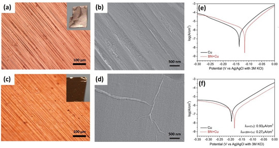 (a) Optical and (b) electron microscope images of bare Cu foil, (c) optical and (d) electron microscope images of BNNS-covered Cu foil, and Tafel plots of the bare and BNNS-covered Cu foil in (e) aerated and (f) nitrogen gas bubbled 0.1 M NaCl solution [96].