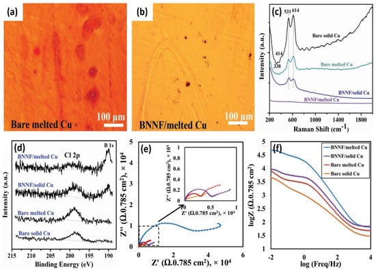 Post-EIS testing (after 1 h in 0.5 M NaCl), the samples’ optical appearance changed noticeably. Corrosion was evident across the entire surface of the bare solid and melted Cu (Figure 3a,b), but only a few small spots appeared on the hexagonal boron nitride nanofilm (BNNF)-coated melted Cu. Further analysis using Raman spectroscopy and X-ray photoelectron spectroscopy (XPS) was conducted to examine the corrosion products after EIS tests. A Raman analysis confirmed the excellent protective performance of the high-quality BNNF on melted Cu (Figure 3c). The strong peaks at 531 and 614 cm−1 and shoulder peaks at 338 and 414 cm−1 indicated the production of Cu(OH)2 or CuO on the bare Cu surface [103,104]. Weak oxidation signals were identified on solid Cu in BNNF-coated samples, but they were almost completely missing on melted Cu. In the XPS assessment (Figure 3d), the BNNF-coated melted Cu had the smallest Cl 2p peak among all samples, indicating the coat’s great efficacy in preserving the surface and restricting Cl− ion transport.
