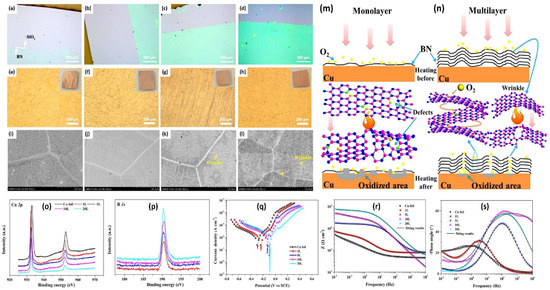 Optical images of (a) 1 L, (b) 5 L, (c) 10 L, and (d) 20 L BN films; digital camera photos of BN-coated Cu foil after 30 days exposure at room temperature (e) 1 L, (f) 5 L, (g) 10 L, and (h) 20 L; SEM images of BN-coated Cu foil after 30 days exposure at room temperature (i) 1 L, (j) 5 L, (k) 10 L, and (l) 20 L; schematic diagrams of the oxidation mechanisms for the (m) monolayer and (n) multilayer BN films; (o,p) XPS spectra of BN-coated and uncoated Cu foils after 30 days exposure at room temperature; (q) potentiodynamic polarization plots; (r) Bode plots; and (s) phase angle vs. frequency plots of the BN-coated and uncoated Cu foils [107].
