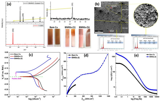 (a) XRD pattern of h-BN (commercial) and BNNSs-(5), (b) SEM and EDX spectrums of bare Cu and with BNNSs-(5), (c) Tafel plotting of bare Cu and BNNSs coated samples, and (d) Nyquist and (e) Bode curves of BNNSs-(5) vs. bare Cu samples [91].