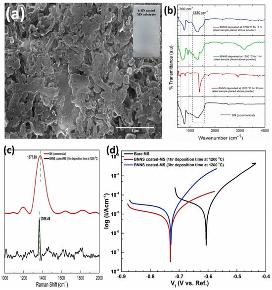 (a) SEM of BNNS-coated MS with inset digital camera photo (1 h deposition time at 1200 °C), (b) FTIR curves, (c) Raman spectra, and (d) Tafel curves of BNNS-coated MS sample [110].