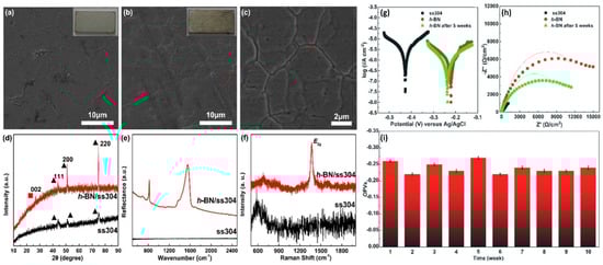 SEM images of (a) bare ss304 and (b,c) h-BN/ss304 with inset digital camera photo (h-BN coated at 650 °C with 150 rf power and 0 V bias), (d) XRD, (e) FTIR and (f) Raman spectra of ss304 and h-BN/ss304 for comparison, (g) Tafel curves and (h) Nyquist plots of samples immersed in 3.5% NaCl for five weeks, and (i) OCP stability of h-BN/ss304 for a total of 10 weeks [117].