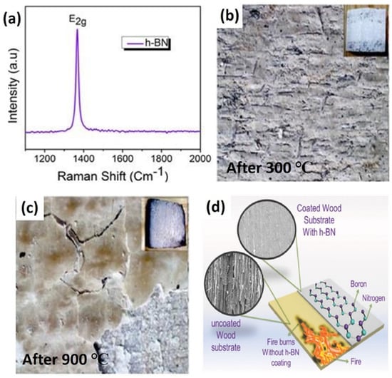 (a) Raman spectra of BNNS-coated wood substrate, oxidation resistance property of BNNS-coated wood substrate at (b) 300 °C and (c) 900 °C, and (d) schematic illustration of the experiment [123].