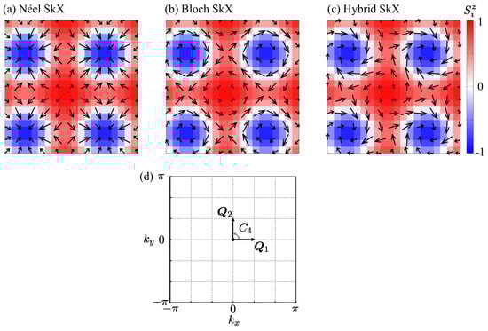 Real-space spin configurations of (a) the Néel-type skyrmion crystal, (b) the Bloch-type skyrmion crystal, and (c) the hybrid skyrmion crystal. The arrows indicate the directions of magnetic moments at each lattice site, while the color scale represents the z component of the spin. The spin textures correspond to (a) , (b) , and (c) in Equation (3). SkX denotes the skyrmion crystal. (d) Momentum space sketch of the two modulation vectors and in the square lattice Brillouin zone. The symmetry relating and is shown.