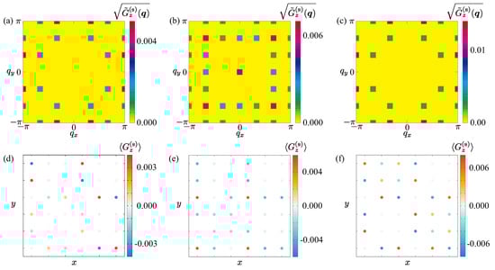 where is the wave vector and means the expectation value at site i. Physically, the structure factor in Equation (6) quantifies the spatial correlations of the electric toroidal dipole moments across the lattice, analogous to how the spin structure factor measures correlations of spins. A peak at corresponds to a ferroaxial alignment, i.e., a uniform ordering of electric toroidal dipoles, whereas peaks at finite vectors indicate modulated or antiferroaxial arrangements. This quantity allows us to identify whether the skyrmion textures host uniform or spatially modulated ferroaxial moments.