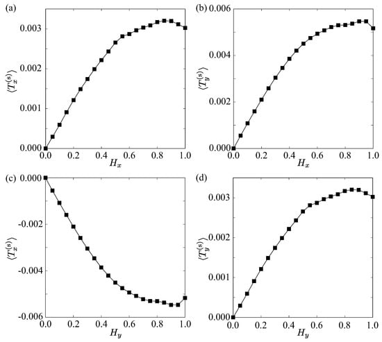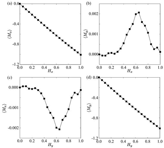 Figure 4a presents the x component of the spin magnetization under a magnetic field applied along the x direction, i.e., and . Here, the component of the spin magnetization is defined as