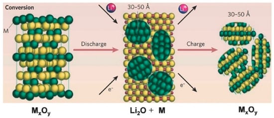 Since the pioneering work by Tarascon in 2000, conversion reaction TMOs have attracted significant attention as potential anode materials for LIBs. These anodes operate through the reaction mechanism MaOb + (2b) Li+ + (2b) e− = aM0 + bLi2O, where M denotes a transition metal [15,16,17,18,19,20,21]. As shown in Figure 1 [39], this approach involves the electrochemical conversion of TMOs into a composite of metal nanoparticles and lithium oxide (Li2O), offering much higher theoretical capacities than conventional graphite anode. Conversion-reaction TMO anodes offer several advantages [15]. Their primary benefit is a significantly higher theoretical capacity, often two to three times greater than graphite, enabling much higher energy density in LIBs. In addition, many TMOs are abundant, low-cost, and environmentally benign, making them attractive for large-scale applications. TMOs also feature high corrosion resistance and facile operation in addition to their high specific capacities [15]. These features collectively make conversion-type TMOs a promising class of high-capacity anode materials.
