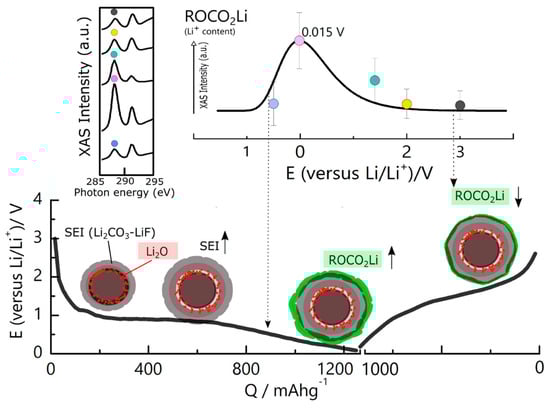 Trend of Li storage in the superficial SEI layer (below 0.7 V) by alkyl lithium carbonates as monitored by the corresponding intensity of the ROCO2Li component at the XAS C K-edge (see marked points of different colors). The ROCO2Li thickness reaches its maximum at 0.015 V, corresponding to the maximum of Li+ content (right-hand panel). Sketch of the SEI formation on the ZFO-C particles during the charging-discharging cycle (E potential vs. Q capacity), distribution, and evolution at each stage of the lithiation-delithiation cycle obtained by the relevant experimental results. The arrows indicate an increase or decrease in the specified component thickness [77]. Copyright 2017 American Chemical Society.