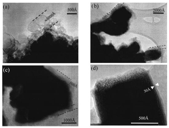 The pioneering work by Laruelle et al. on CoO electrodes revealed that a gel-like polymeric film significantly contributed to the anomalous extra capacity observed at low potentials that is beyond what could be accounted for by the conventional conversion reaction of CoO to Co and Li2O [25]. As shown in Figure 3 [25], four CoO-based electrodes (a–d) were examined by TEM after different cycling conditions. A veil-type film formed after the first discharge to 0.02 V (Figure 3a), which condensed into a dense ~500 Å polymeric coating upon repeated cycling between 0.02–1.8 V (Figure 3b). Figure 3c demonstrates that this coating remains stable and does not further evolve when the cell continues cycling over the same voltage range. However, after full reoxidation to 3 V (Figure 3d), the thick coating disappeared, leaving only a thin (~30 Å) SEI on the reformed CoO nanoparticles. The TEM results demonstrate the appearance/disappearance of the polymer/gel-like coating, as CoO/Li cells were cycled over the 0.02 to 3 V range. This finding highlighted the essential role of surface phenomena in determining the total charge storage capacity of TMO anodes [25]. Further evidence was provided by Hu et al. (2013) using high-resolution solid-state NMR spectroscopy in combination with synchrotron X-ray diffraction and absorption techniques on RuO2 electrodes. Their comprehensive analysis revealed a reversible redox reaction involving lithium-containing gel-like species, which operated alongside the conventional conversion reaction and contributed to the enhanced lithium storage capacity of the material [35]. Similar behavior has been observed in α-Fe2O3 nanostructures. Yao et al. (2011) attributed the high capacity and rate capability of porous α-Fe2O3 nanorods partly to a soft, ionically conductive gel-like interphase formed from electrolyte decomposition, which accommodates volume change and provides pseudocapacitive storage [82]. In α-Fe2O3@graphene core–shell composites [83], the conductive shell likely stabilizes a thin, resilient gel-like film, suppressing unstable SEI growth while enabling fast transport and enhanced cycling stability.