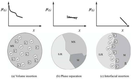 A sequence of three different stages of lithium storage. Insertion in the bulk of MX (a). If the solubility limit is exceeded, a heterogeneous solid-state reaction characterized by phase separation occurs (b). Finally, the interfacial charging takes place (c) [33]. Copyright 2003 The Royal Society of Chemistry.
