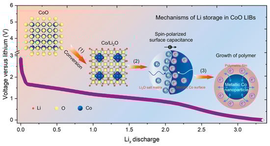 Schematics of the lithium reaction mechanisms in CoO LIBs. The lithium storage in CoO across different voltage ranges involves conventional conversion reactions, interfacial charge storage via a spin-capacitor effect, and the formation of polymeric films [105]. Copyright 2021 Wiley-VCH GmbH.