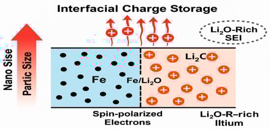 Spin-polarized electron storage at the phase boundary of metal nanoparticles and Li2O has emerged as a compelling mechanism to explain the anomalous extra capacity observed in TM conversion anodes. Using in situ magnetometry, Li et al. (2021) demonstrated that Fe nanoparticles in Fe/Li2O nanocomposites can store spin-polarized electrons during discharge in Fe3O4/Li model systems [104]. This phenomenon led to extra reversible capacity and measurable changes in interfacial magnetization. The mechanism involves spatial charge separation at the metal/Li2O interface: lithium ions migrate into the Li2O matrix, while spin-polarized electrons remain localized on the metallic Fe surface. Similar behavior has been observed in other TM-based electrodes such as CoO, NiO, FeF2 and Fe2N, suggesting that spin-polarized electron storage is a general and intrinsic property of many conversion-type systems. These findings sparked broad interest in the role of spin-polarized surface capacitance at TM/Li2O interfaces [104]. Li et al. (2021) confirmed that such interfaces can act as nanoscale, redox-active capacitors, enabling decoupled and reversible storage of lithium and electrons beyond the limits of classical conversion or intercalation reactions [104]. As illustrated in Figure 5 [105], this mechanism relies on the spatial separation of charge carriers: Li+ ions accumulate within the Li2O phase, while spin-polarized electrons are confined to the TM nanoparticle surface. A Li2O-rich SEI formed during early cycling helps stabilize the interface and mitigate electrolyte decomposition, allowing the interface to function as a reversible, redox-active region [105]. Particle size plays a key role in enhancing this effect. Bock et al. systematically showed that reducing Fe nanoparticle size increases interfacial area, which boosts the density of active charge storage sites and accelerates charge transport due to shorter diffusion paths. As shown in Figure 6, there is a clear inverse correlation between particle size and total reversible capacity, confirming the tunability of spin-polarized electron storage through nanoscale engineering [106].