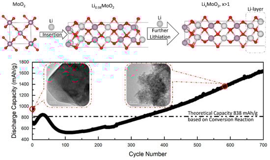 - Shon, J.K.; Lee, H.S.; Park, G.O.; Yoon, J.; Park, E.; Park, G.S.; Kong, S.S.; Jin, M.; Choi, J.-M.; Chang, H.; et al. Discovery of abnormal lithium-storage sites in molybdenum dioxide electrodes. Nat. Commun. 2016, 7, 11049. [Google Scholar] [CrossRef]