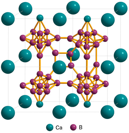 Mechanochemical synthesis has recently gained renewed attention as a solvent-free, energy-efficient approach for advanced ceramics [12]. This renewed interest has been comprehensively reviewed in recent literature [13]. Previous reports describe CaB6 production by mechanochemical activation of Ca/B2O3 blends [14], high-temperature sintering routes [15], and colemanite-based carbothermal methods involving transient B4C phases [16]. These studies highlight the diversity of mechanochemical and thermal approaches; however, none of them address the direct, ambient-condition mechanochemical synthesis from anhydrous colemanite, which is the novelty of the present work. Figure 1 shows the schematic representation of the cubic CaB6 crystal structure, where covalently bonded boron octahedra are stabilized by calcium atoms.