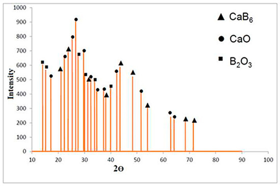 A sintering temperature of 350 °C was selected to enable XRD phase identification while minimizing grain growth and preventing the formation of secondary carbide phases. This temperature was considered adequate for structural analysis, as it allowed crystallization of CaB6 without promoting additional reactions. The diffraction patterns were refined to suppress background noise, and characteristic peaks of both the desired product and the by-products were clearly resolved in Figure 3. The reflections of CaB6 confirmed the formation of a cubic structure (Pm3̅m), while the accompanying peaks of CaO and B2O3 further indicated partial oxidation, consistent with earlier reports on boride syntheses from natural boron minerals [18,24,25,26].
