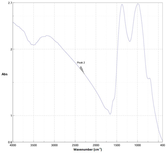 In addition to XRD, FT-IR spectroscopy was employed to further characterize the reaction products. Comparison of the spectra with literature reports showed that peak areas varied depending on reactant concentration, reflecting changes in Ca–B bond intensities. The sample with the largest peak area was considered to represent the most favorable synthesis conditions, and its spectrum is presented in Figure 4.
