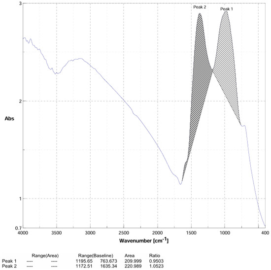 In addition to XRD, FT-IR spectroscopy was employed to further characterize the reaction products. Comparison of the spectra with literature reports showed that peak areas varied depending on reactant concentration, reflecting changes in Ca–B bond intensities. The sample with the largest peak area was considered to represent the most favorable synthesis conditions, and its spectrum is presented in Figure 5.