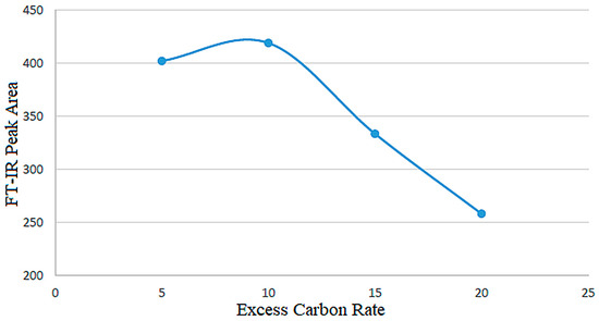 FT-IR peak areas served as semi-quantitative indicators of Ca–B bond formation. As shown in Figure 6, the carbon-to-colemanite ratio was varied at a fixed reaction time of 840 min. The highest peak area was obtained at 10:1 (2× stoichiometric, CO2 basis), confirming that an excess of carbon is necessary to drive the reaction. Comparable requirements for surplus carbon have been reported in carbothermal syntheses of other metal borides [26], confirming that a stoichiometric excess of reductant is a general necessity in boride formation.