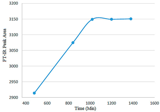 As shown in Figure 7, the reaction time was varied while keeping the optimal carbon-to-colemanite ratio (10:1; 2× stoichiometric, CO2 basis) constant. The highest FT-IR peak area (3149 a.u.) was obtained at 1020 min, which was identified as the optimum duration. Beyond this point, no further increase was observed, indicating that the reaction had reached a plateau. The combination of a 10:1 (2× stoichiometric, CO2 basis) and a reaction time of 1020 min resulted in the highest FT-IR peak area (3149 a.u.).