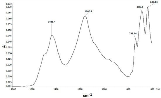 The FT-IR spectrum of the synthesized sample exhibited several absorption bands in the 500–4000 cm−1 region. Distinct bands at 685 and 730 cm−1 were attributed to B2O3, in agreement with previous reports [14,16,23,24]. Characteristic Ca–B vibrational modes were concentrated in the 500–1500 cm−1 sub-region, and peaks at 1435 and 1160 cm−1 confirmed Ca–B stretching vibrations [14,23,24]. These values are consistent with previously reported spectra of CaB6 and boron oxides, confirming the successful formation of the target phase alongside minor by-products. Peak areas were integrated after baseline correction to enable semi-quantitative comparison of Ca–B bond formation, and the procedure is illustrated in Figure 5.