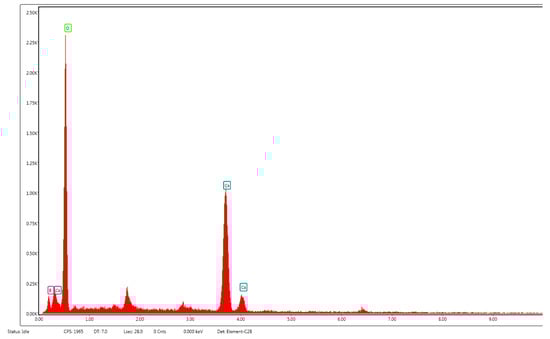 The EDX spectrum (Figure 10) confirmed the elemental composition of the purified sample, indicating the presence of calcium, oxygen, and boron. Although the boron signal was clearly visible, its quantification is considered semi-quantitative due to the low atomic number of boron and its limited X-ray emission efficiency. Nevertheless, the simultaneous detection of Ca and B, together with residual O, is consistent with the formation of CaB6 alongside minor traces of CaO. Similar limitations in accurately quantifying boron by EDX have been reported in previous studies [18,19]. Semi-quantitative EDX analysis indicated the presence of Ca, B, and O. After normalization, the Ca/B ratio was close to the theoretical 1:6 stoichiometry, whereas oxygen was attributed to residual CaO/B2O3 phases. Although boron quantification remains challenging due to its low atomic number, the combined XRD, FT-IR, and EDX data consistently verify CaB6 as the main phase.