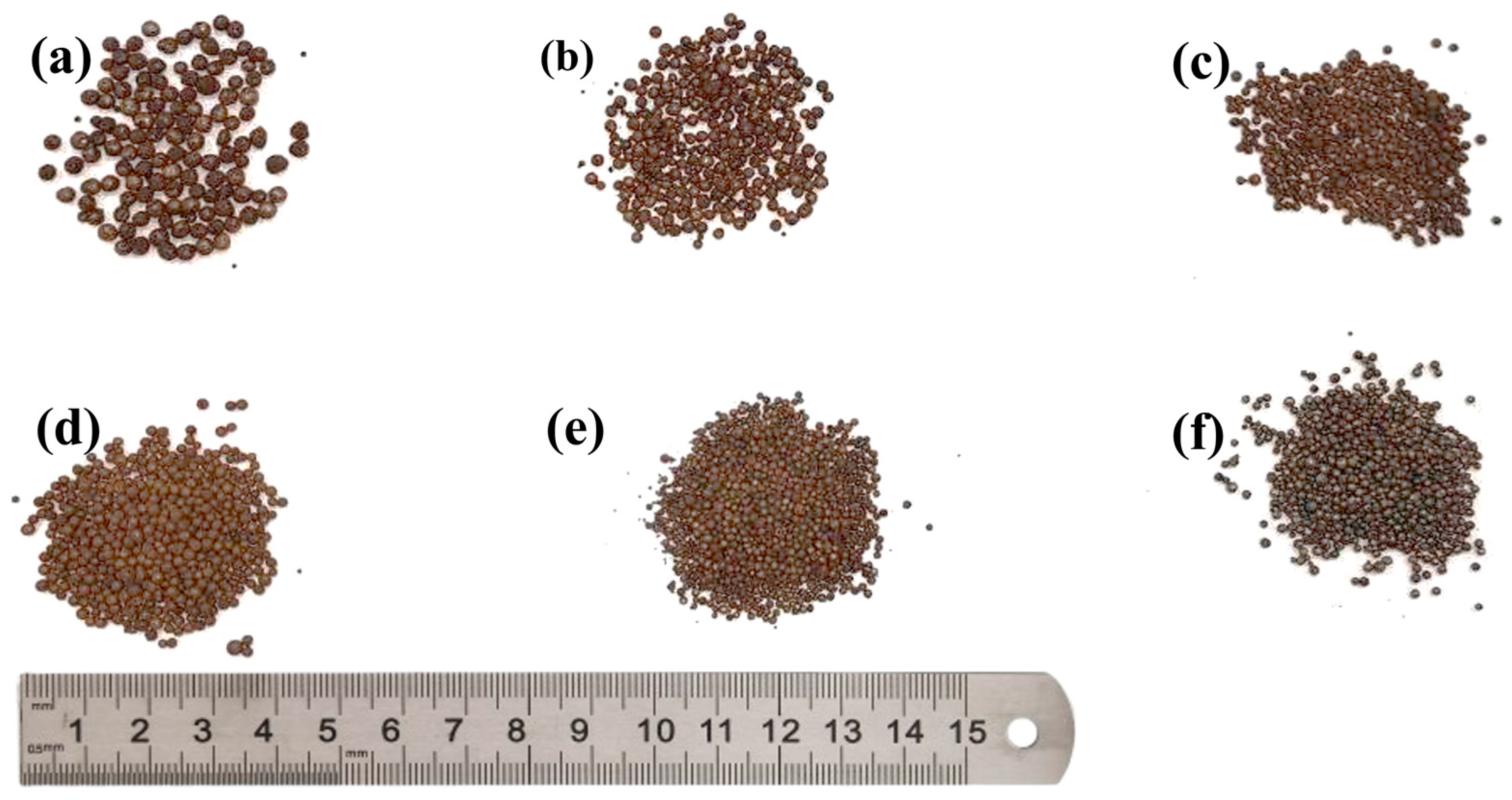 44]. Processing and interpretation of the obtained diffraction patterns were carried out using the HighScore Plus software package version 3.0.5. The sizes and elemental composition of the metallic powders were examined using scanning electron microscopy (SEM) with an SEM3200 instrument (CIQTEK Co., Ltd., Hefei, China). After the experiment, the obtained powder was sieved to below 100 microns using an AS 200 sieving machine (Retsch, Hann, Germany). Using the Fiji software, version 2.17.0, we carried out particle morphology analysis: the scale was set using a ruler, the powder particles were segmented by threshold processing and the ‘Analyze Particles’ command, where their geometric parameters (area, perimeter, Feret’s diameter, circularity) were obtained. The results were saved in a CSV file, and then in Python version 3.13.7 a classification was performed according to the degree of circularity (perfectly spherical, 0.8–1.0; moderately spherical, 0.6–0.8; and irregularly shaped, below 0.6), and illustrative diagrams were plotted. The measurement of powder sizes up to 100 microns was carried out using a Winner2005A laser particle size analyzer (Jinan, Shandong Province, China). Distilled water was used as the dispersant, the sample concentration was 12.84444, the analysis mode was lognormal distribution, and the measurement range was 0.01–1000 μm.