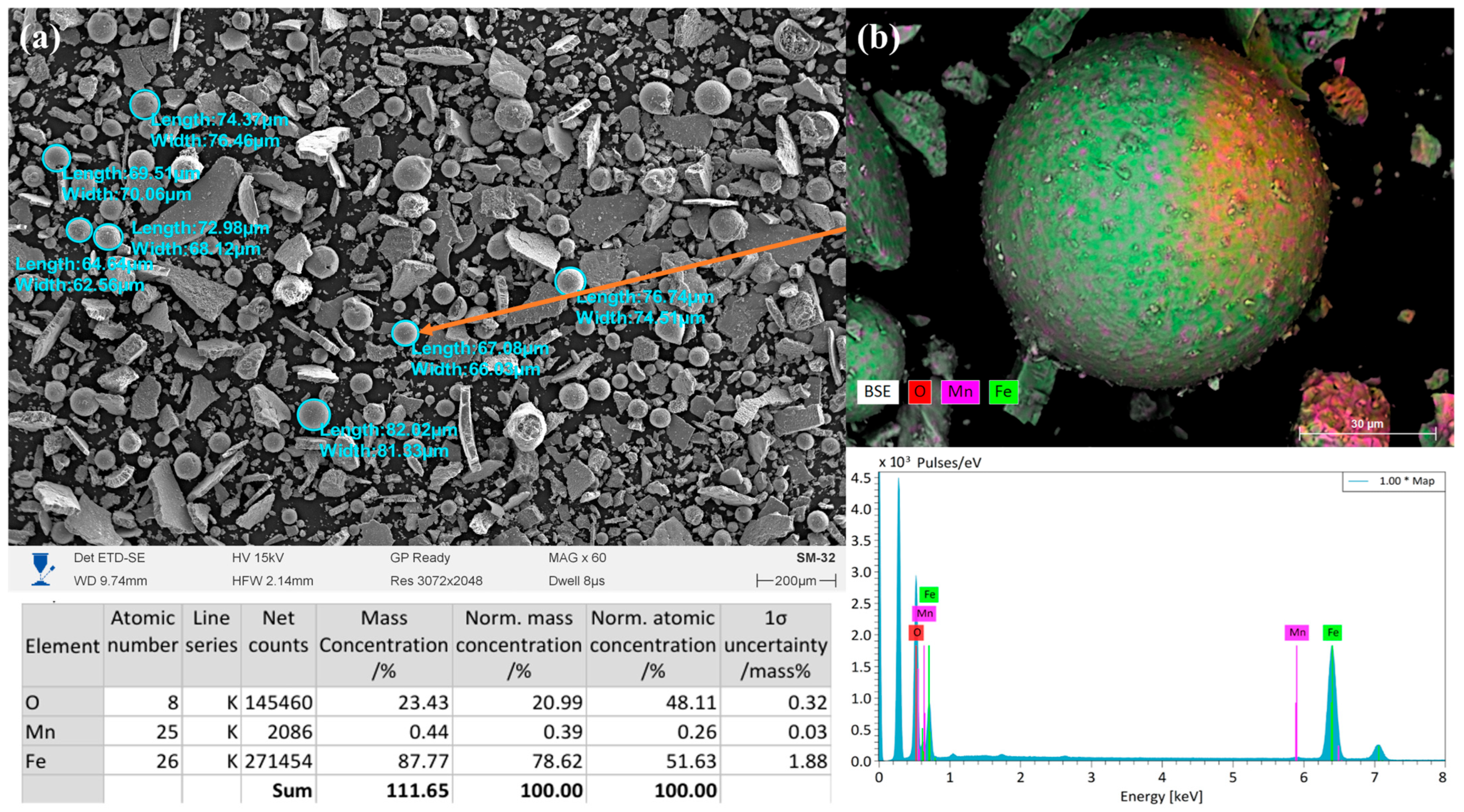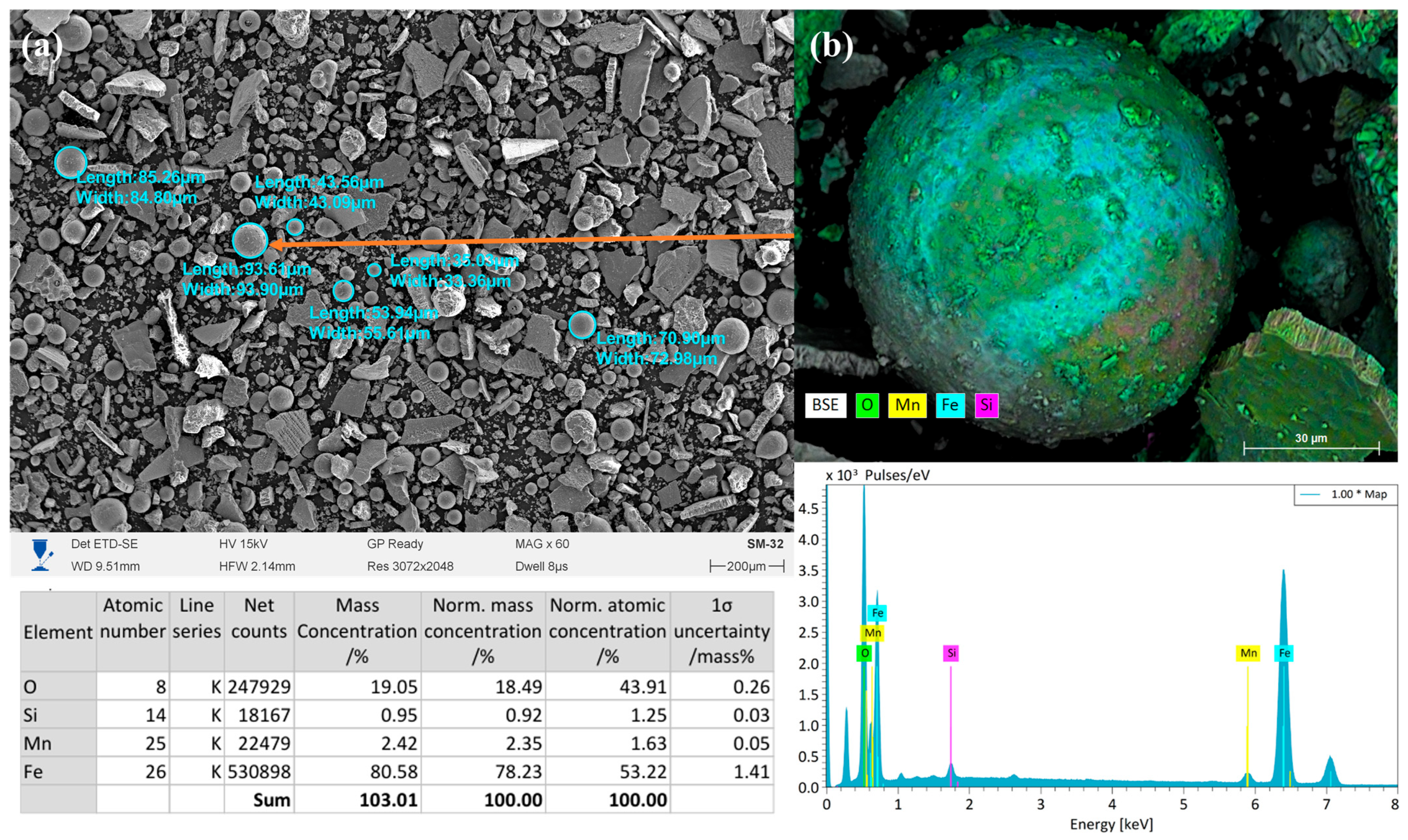 Figure 5, was characterized by a more homogeneous morphology compared to that from the single-stage mode. SEM images show that spherical and rounded particles with diameters of 60–80 μm predominated, along with some angular fragments. The size of the spheres ranged from 62 to 82 μm, which was slightly smaller than that in the single-stage mode at 350 V. This is attributed to the milder dispersion conditions and process stabilization achieved by lowering the voltage. EDS analysis showed that the powder consisted predominantly of iron (87.77 wt.%), with a significant oxygen content (23.43 wt.%), indicating the formation of oxide layers on the particle surfaces. The manganese content was minimal (0.39 wt.%), which may have been associated with its local segregation or presence in the form of fine oxide inclusions. Compared to that in the powder obtained at a constant 350 V, a higher oxygen content is observed, indicating more pronounced surface oxidation. Surface mapping (EDS mapping) confirmed a uniform distribution of Fe throughout the particle volume, while oxygen was concentrated mainly on the surfaces of the spheres, forming oxide shells. Mn was detected in the form of point inclusions, which is consistent with its low concentration. Thus, the powder synthesized in the two-stage mode exhibited a predominantly spherical morphology with an oxide shell and a high Fe content. The combination of short-term high energy (350 V) followed by a milder regime (250 V) promoted the formation of more homogeneous spherical particles but enhanced surface oxidation processes. This may have affected the performance properties of the material—enhancing its stability and adhesion characteristics while reducing the purity of the metallic phase.