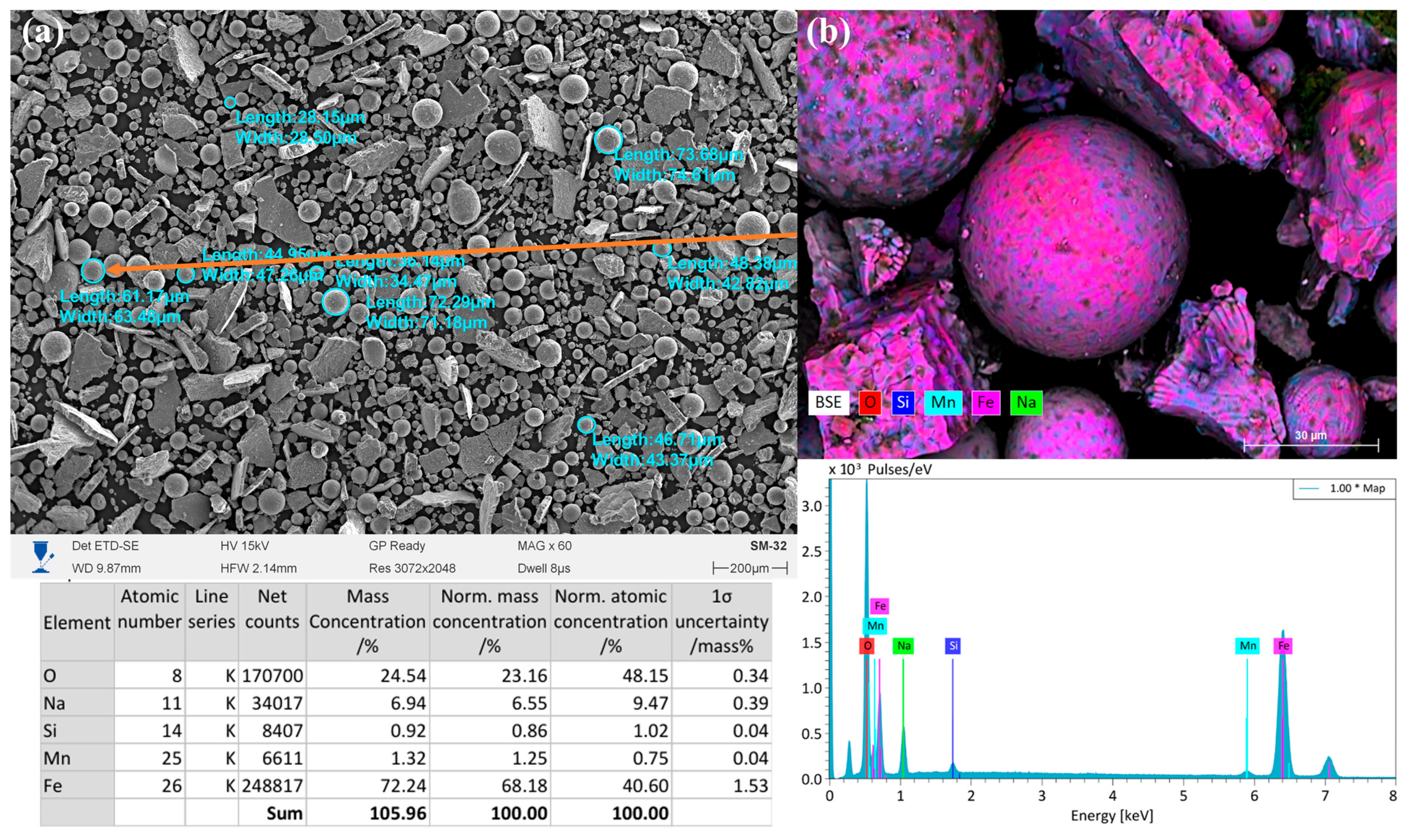 Figure 4b, confirm the predominance of iron (about 80 wt.%) and a significant oxygen content (≈19 wt.%), indicating pronounced surface oxidation, which is fully consistent with the XRD results. In addition, Mn (≈2.4 wt.%) and Si (≈1 wt.%) were detected in the composition, which could not be identified by X-ray diffraction due to their low concentration but were localized on the particle surfaces and may have acted as microalloying impurities.