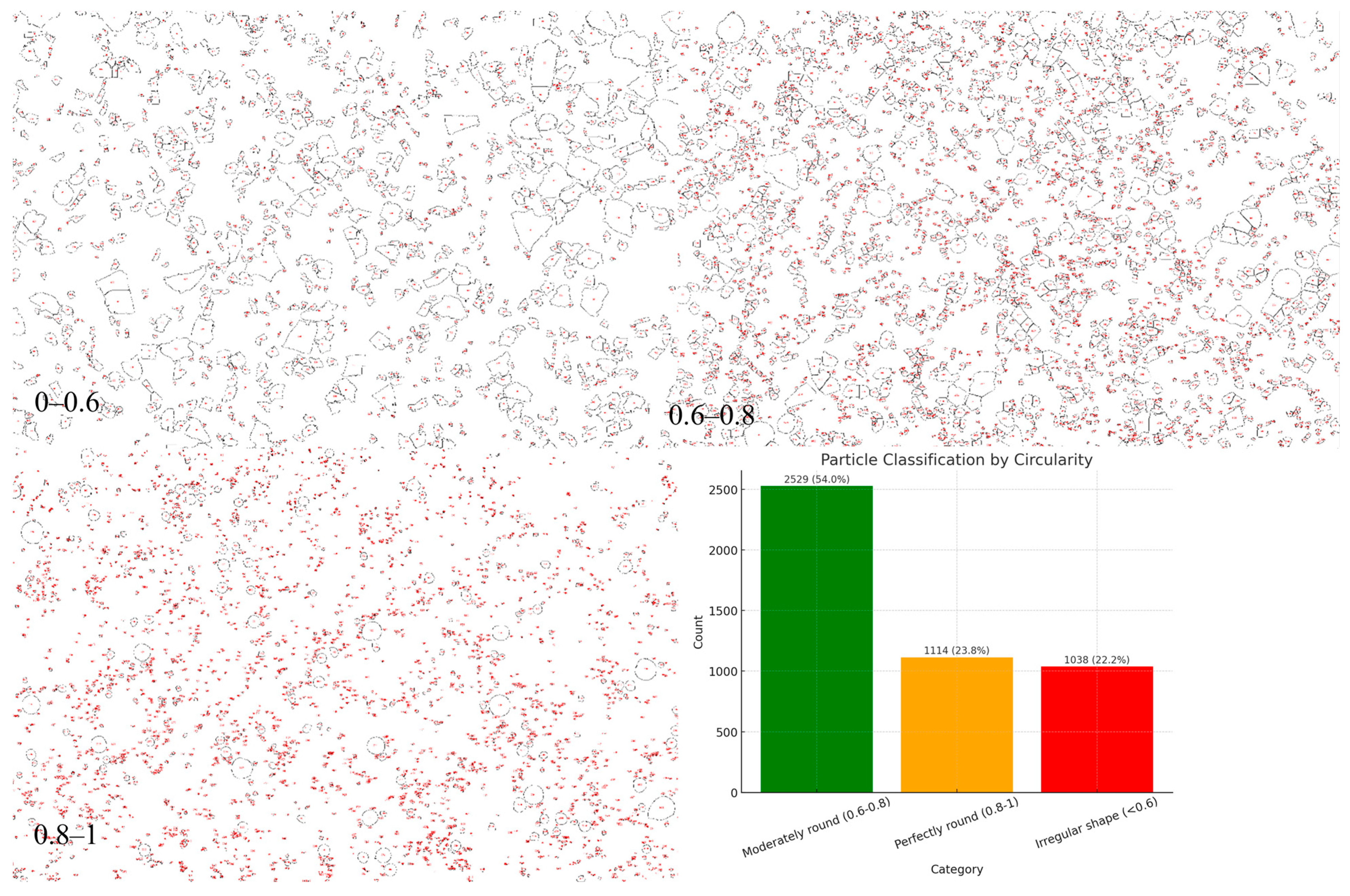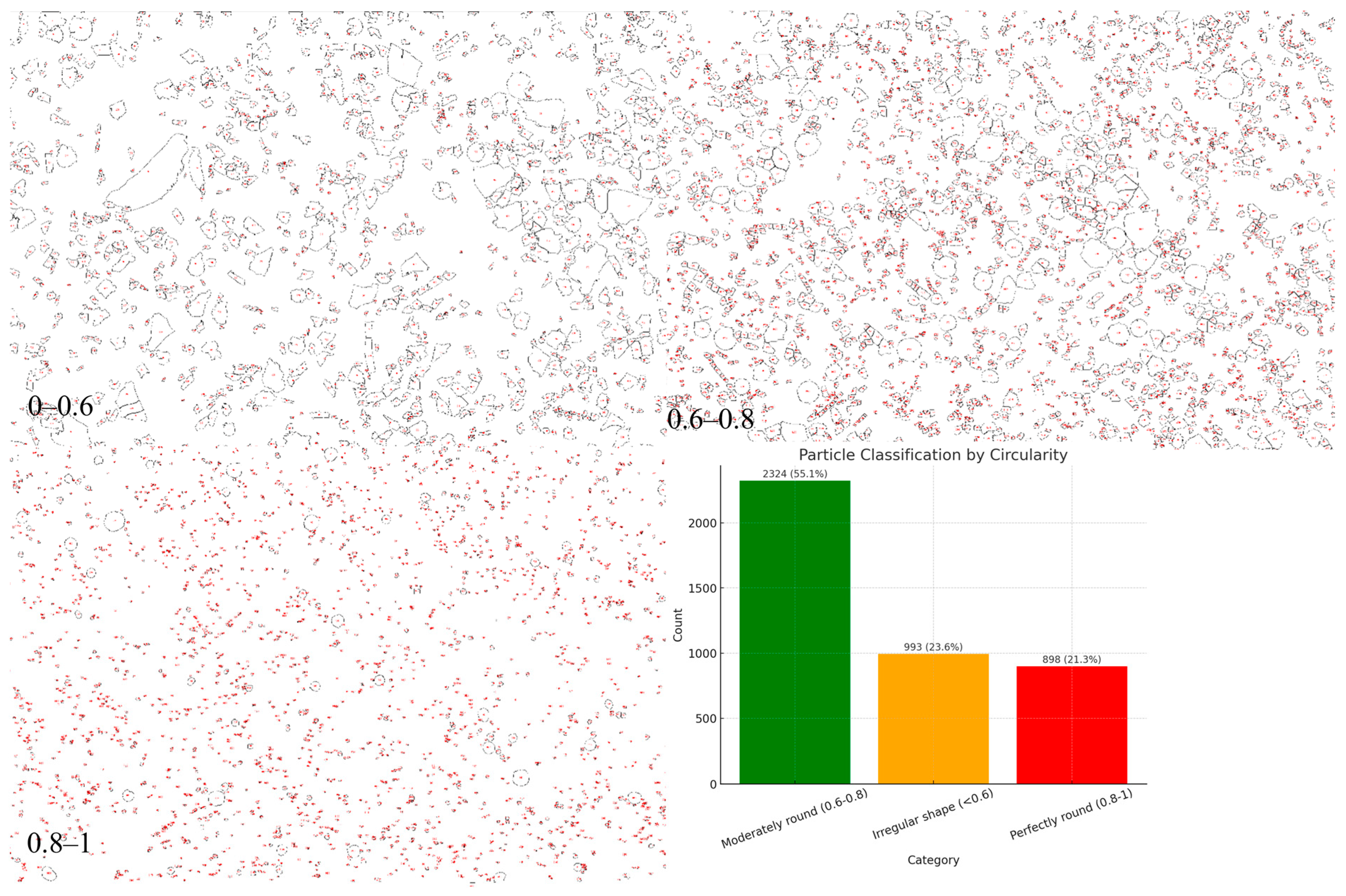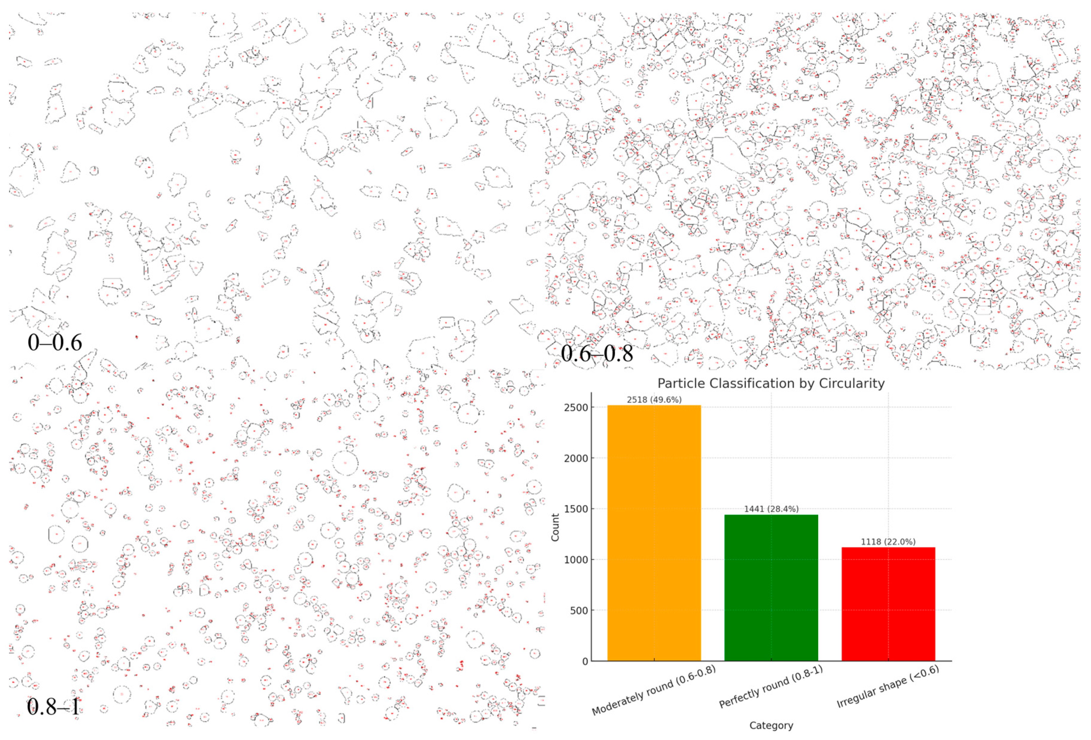 Figure 7, the predominance of particles with a moderate degree of circularity. According to the classification results based on the circularity parameter, the largest portion of the powder (54.0%, 2529 objects) belonged to the category of moderately rounded particles (0.6–0.8). The fraction of particles with a high degree of sphericity (perfectly rounded, 0.8–1) was 23.8% (1114 objects), which indicates the formation of a fairly significant fraction of spherical granules. At the same time, about 22.2% (1038 objects) had an irregular shape (circularity < 0.6), which indicates the presence of deformed and fragmented structures formed under conditions of unstable cooling and non-uniform exposure to plasma–electrolytic discharges. In the one-stage mode of electro-plasma synthesis in a NaCl medium, a powder was formed in which moderately rounded particles predominated, with a relatively uniform distribution between the fractions of perfectly spherical and irregularly shaped particles. These results indicate that the one-stage mode provides satisfactory morphology characteristics; however, it requires further optimization to increase the proportion of perfectly spherical granules and reduce the number of defect-shaped particles.