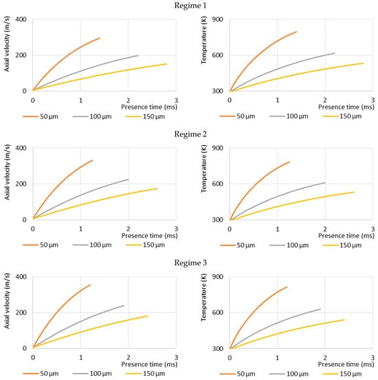 Figure 5 shows the influence of particle size on their axial velocities and temperatures at three different plasma reactor regimes (Regime 1, Regime 2, Regime 3 according to Table 1). This indicates that particle size is a very important factor in determining the particle velocity and temperature variation, even when the particles are injected under the same plasma jet conditions. The velocities of the smaller particles (50 μm) are up to two times higher than the larger ones (150 μm) at the reactor exit nozzle. The acceleration of all-sized particles is high at the beginning of the reactor but significantly decreases subsequently. Also, it can be noted that at different plasma reactor regimes, higher velocities are achieved by particles injected into the higher velocity plasma jet. It is influenced by an increased drag force applied to the particles. Plasma jet velocity increases by 25% (from 690 m/s to 860 m/s), and it affects the particle velocity increase by around 20% (from 290 m/s to 350 m/s for smaller particles and from 150 m/s to 180 m/s for bigger ones). Particle Reynolds number Rep ranges by regime and particle size