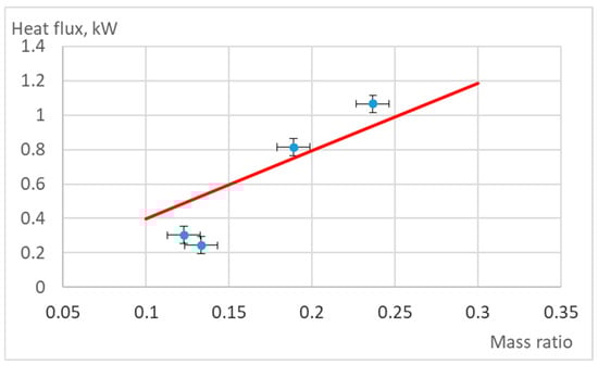 The amount of energy transferred from the plasma jet to the particles for their heating was determined experimentally and analytically. Experimentally, it was assumed that the heat flux to the particles is equal to the difference between the measured heat flux from the plasma jet to the reactor walls with dispersive particles in the reactor and the heat flux without particles. At constant plasma reactor parameters, the mass ratio of dispersive particles and plasma-forming air flow was changed, and the heat flux to the particles was evaluated. The results are presented in Figure 8.