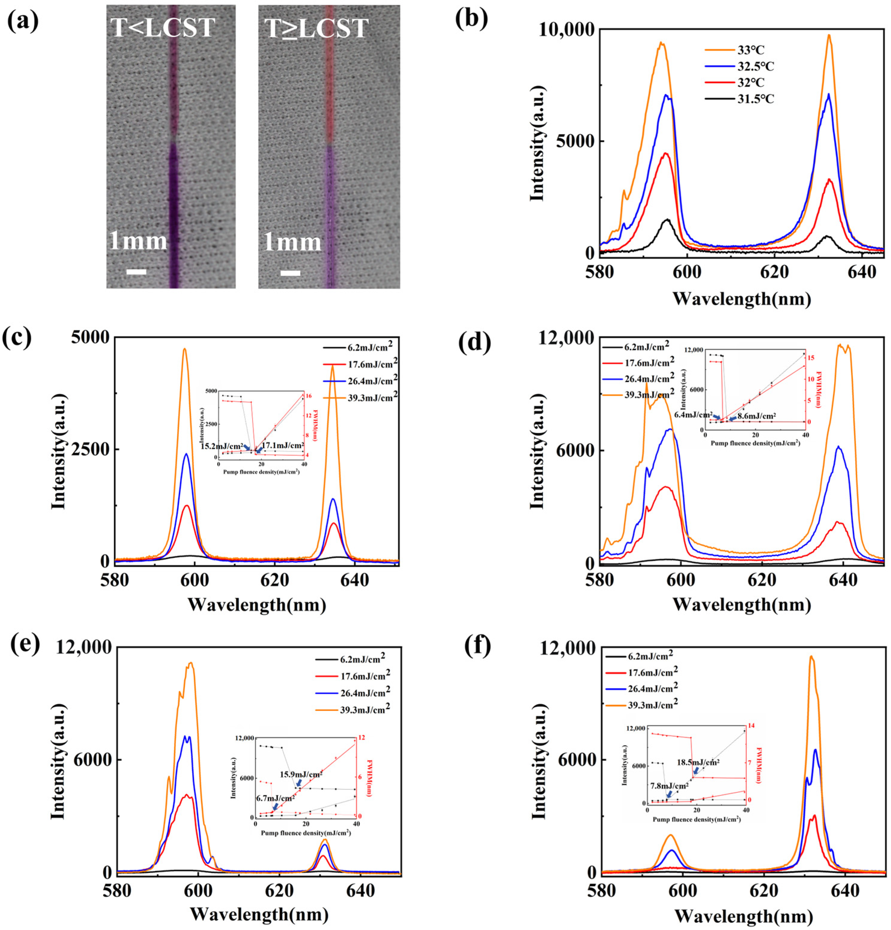 - Zhu, R.; Tong, J.H.; Shi, X.Y.; Lin, C.Y.; Zhai, T.R. Phase transition modulated fiber-shaped random lasers. Opt. Express 2025, 33, 13430–13438. [Google Scholar] [CrossRef] [PubMed]