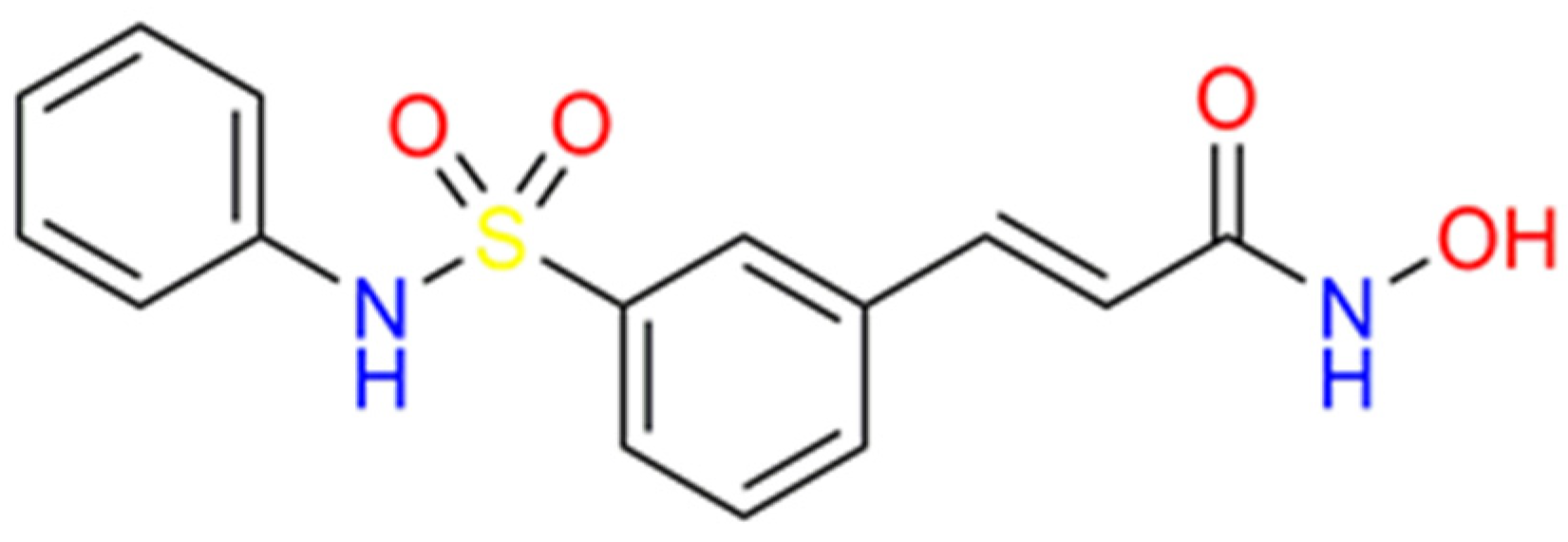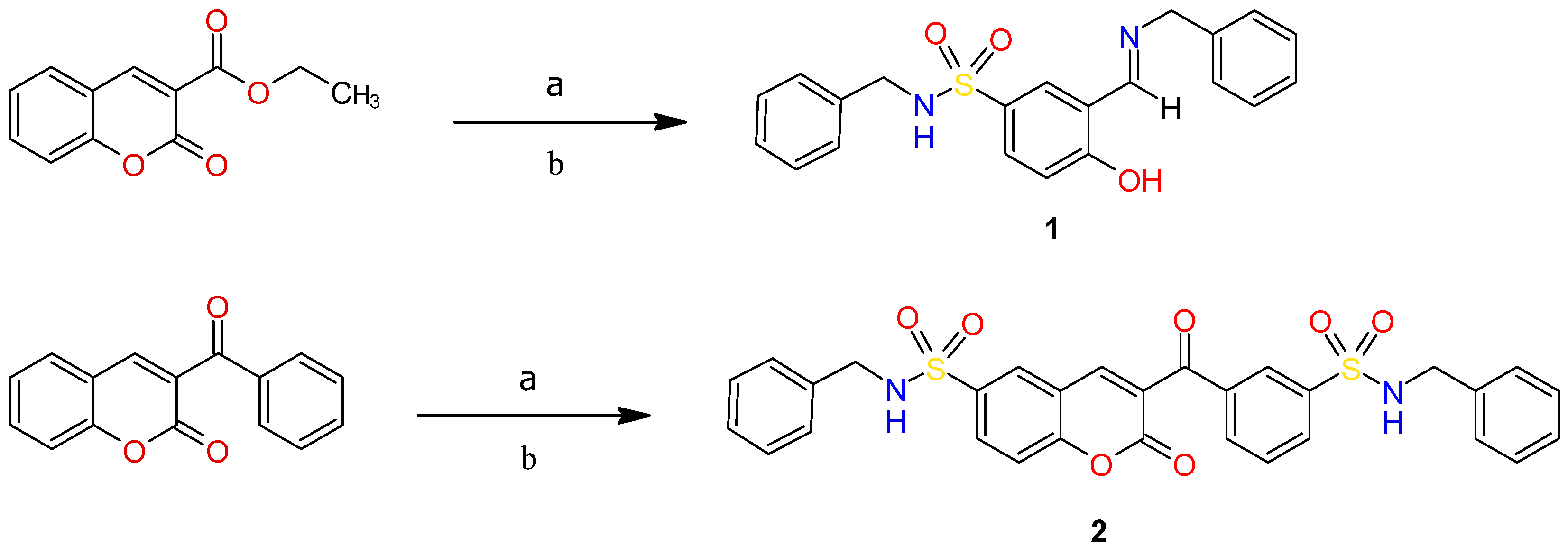 Coumarin sulfonamide derivatives have demonstrated various biological activities such as antimicrobial, antiviral, antifungal and anticancer [3]. Compounds 1 ((E)-N-benzyl-3-((benzylimino)methyl)-4-hydroxybenzenesulfonamide) and 2 (N-benzyl-3-(3-(N-benzylsulfamoyl)-2-oxo-2H-chromene-6-sulfonamide) are benzenesulfonamides, synthesized from a coumarin scaffold (Scheme 1). In compound 1, an imine was formed following the opening of the lactone heterocycle, whereas compound 2, retaining the 3-benzoylcoumarin scaffold, features a double sulfonamide moiety. Their synthesis has been reported elsewhere [4]. Compounds 1 and 2 are structurally related to the commercially available drug belinostat (Figure 1), a histone deacetylase (HDAC) inhibitor used in the treatment of peripheral T-cell lymphoma [5]. Both compounds exhibited in vitro antiproliferative activity comparable to that of cisplatin, doxorubicin, and belinostat over MCF-7 and MDA-MB-231 breast cancer cell lines [4].