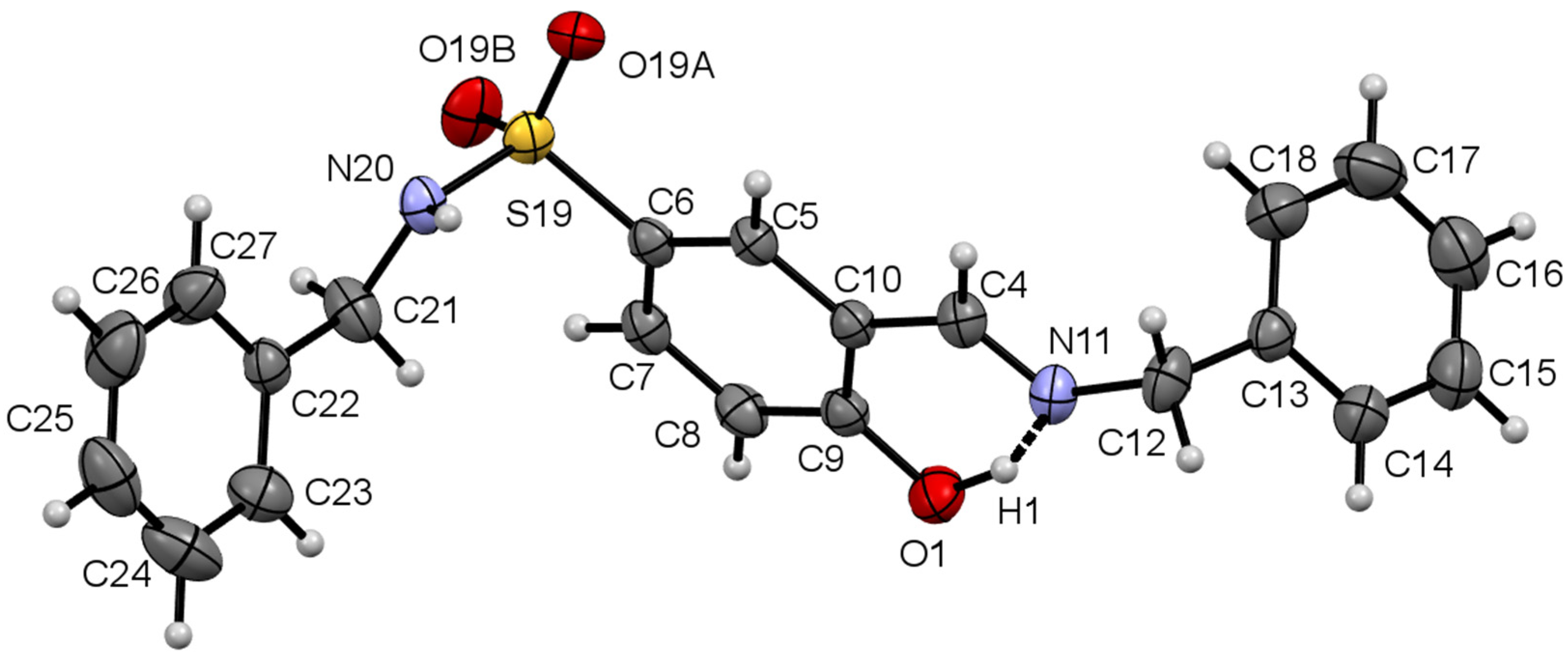 It is worth making a brief comparison between compounds 1 and 2 and belinostat. Like compound 2, three of the six crystal structures of belinostat crystallize in the monoclinic crystal system and the P21/c space group [7]. In compound 2, the C3=C4 double bond is coplanar with the aromatic ring (C3–C4–C10–C9: 0.62(7)°). In contrast, in belinostat, the semiflexible nature of the molecule allows torsion angles relative to the central aromatic ring to vary from −179.15(18)° to 17.8(14)°. Compound 1, on the other hand, features an imine instead of the α,β-unsaturated system, which remains coplanar with the central aromatic ring (C9–C10–C4–N11: 0.9(5)°) due to an intramolecular hydrogen-bonding interaction. In the sulfonamide region, compounds 1 and 2 feature a benzyl moiety with an additional methylene group compared to belinostat, providing greater conformational flexibility.