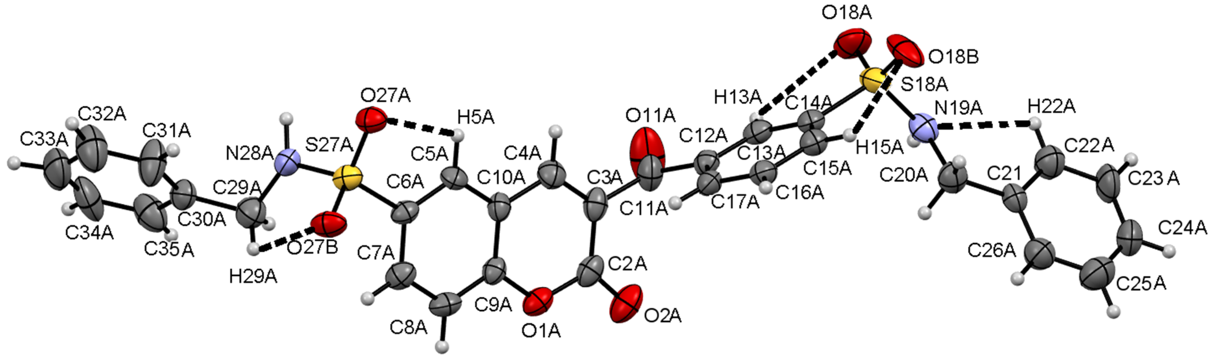 Compound 2 crystallizes in the monoclinic space group Cc with four independent molecules in the unit cell. These four molecules are arranged in two pairs, where each pair is interlinked by N–H···O=S and C–H···O=C intermolecular hydrogen bonds (Figure S1). The superposition of the four independent molecules is shown in Figure S2. The exocyclic and lactone carbonyls present an anti conformation with respect to each other. The 2H-chromene ring system is planar (O1–C9–C10–C4: 1.025(7)°). The benzoyl moiety is almost perpendicular to the coumarin mean plane (C4–C3–C11–O11: −96.975(8)°). Similarly, both sulfonamide moieties are almost perpendicular to the aromatic rings (C5–C6–S27–N28: 98.275(4)°, C13–C14–S18–N19: 94.375(4)°). In the independent molecules 2A, 2C, and 2D, two intramolecular hydrogen bonds C13X–H13X…O18Y and C15X–H15X…O18Y (X = A, C, D, Y = A–B, E–H) define an  S 2 2 (8)[S(5)S(5)] pattern (Figure 3 and Figure S3). In 2C, the intramolecular hydrogen bonds C5C–H5C…O27E and C7C–H7C…O27F define the same pattern. The intramolecular three-center hydrogen bond O18B…H13B…O18C in 2C leads to an almost completely planar arrangement in the structure (C13B–C12B–C11B–O11B: 1.3(16)°).