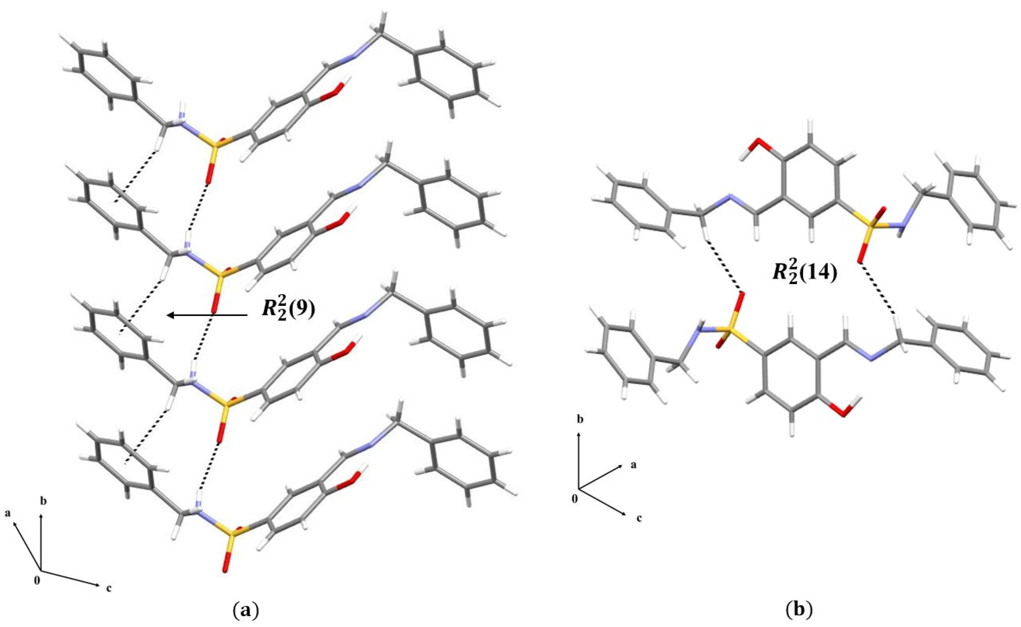The intermolecular hydrogen bonding interactions and their geometric parameters are listed in Table 3. The supramolecular structure of 1 is defined by N20–H20···O19B interactions, which form C(4) chains in a similar way to the crystal structure of belinostat [34] and the 4-methyl-N-(4-methyl-benz-yl)benzene-sulfonamide [35]. This motif propagates along the b axis, forming a ribbon-like structure (Figure 4a). This network is also stabilized by C–H…π interactions, C21–H21B…Cg(3) (C22–C27), with a C…π distance of 3.715(4) Å, which also propagates along the b axis. The N20–H20···O19B and C21—H21B…Cg(3) interactions assemble as an R22(9) ring motif. The third dimension is provided by the self-complementary C12–H12…O19A interaction, which forms an R22(14) ring motif and centrosymmetric dimers running in the ac plane (Figure 4b).