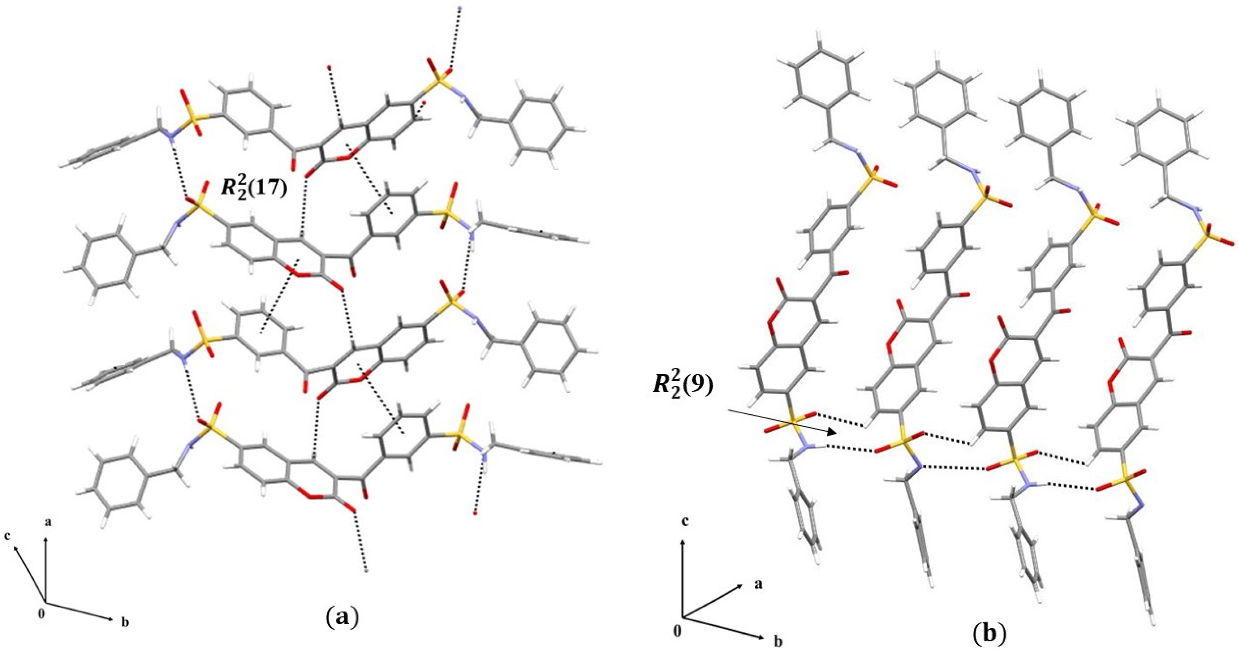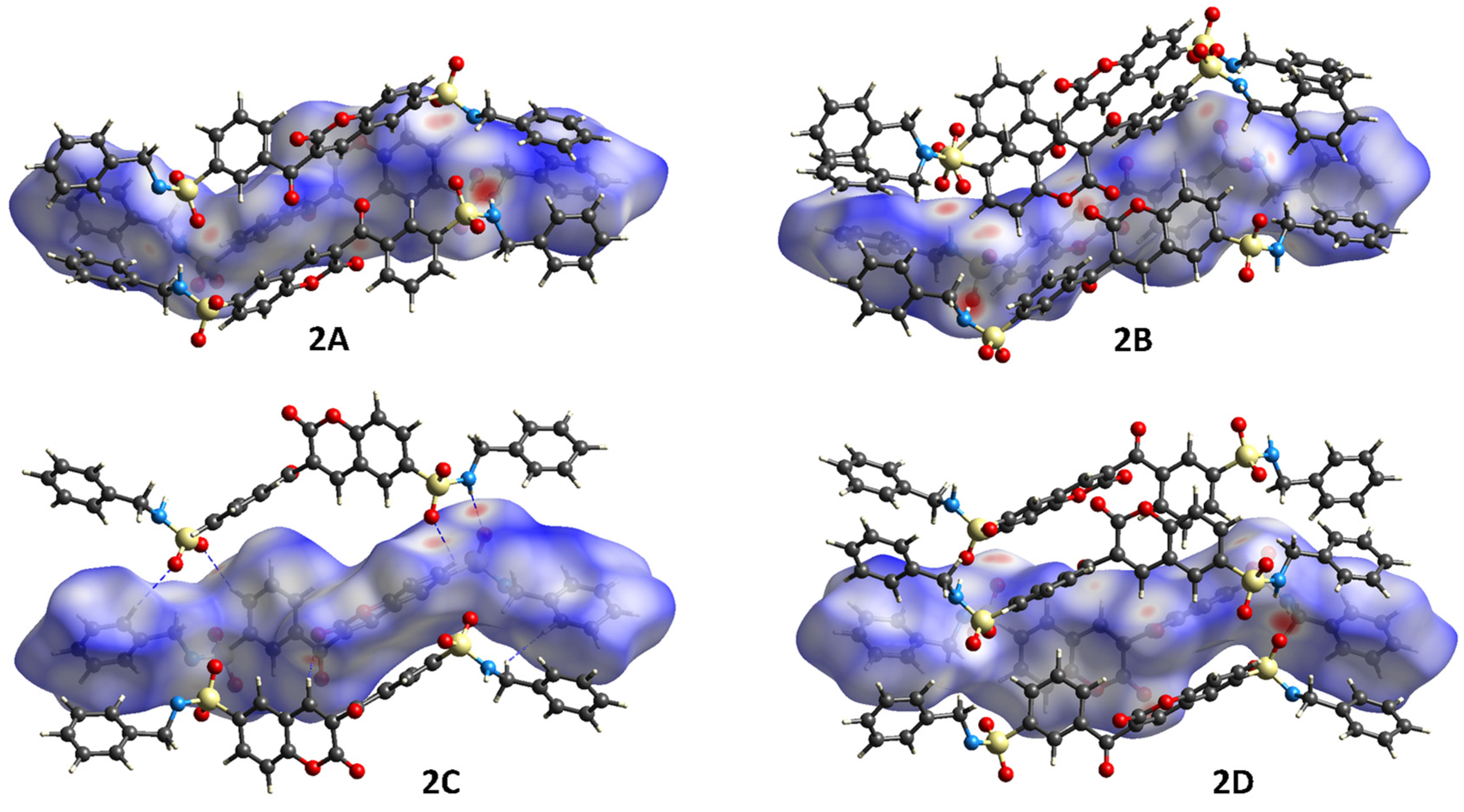 Compound 2 has two N-benzylbenzenesulfonamide groups, (O18)2S18N19H19 and (O27)2S27N28H28, which are linked to the PhCO and the benzofused-coumarin rings, respectively. It is worth noting that N19H19 acts as a better hydrogen bonding donor than N28H28, contributing to the development of the 1D and 3D, respectively. In addition, there is also a differentiated acceptor capability between the S27O27 and S18O18; only the first sulfonamide participates as a sulfonamide hydrogen bonding acceptor. Furthermore, the S18O18, C2O2, and C11O11 behave as soft HB-acceptors, participating as such in C–H∙∙∙O interactions, and both carbonyls also in n → π interactions, developing the 2D.