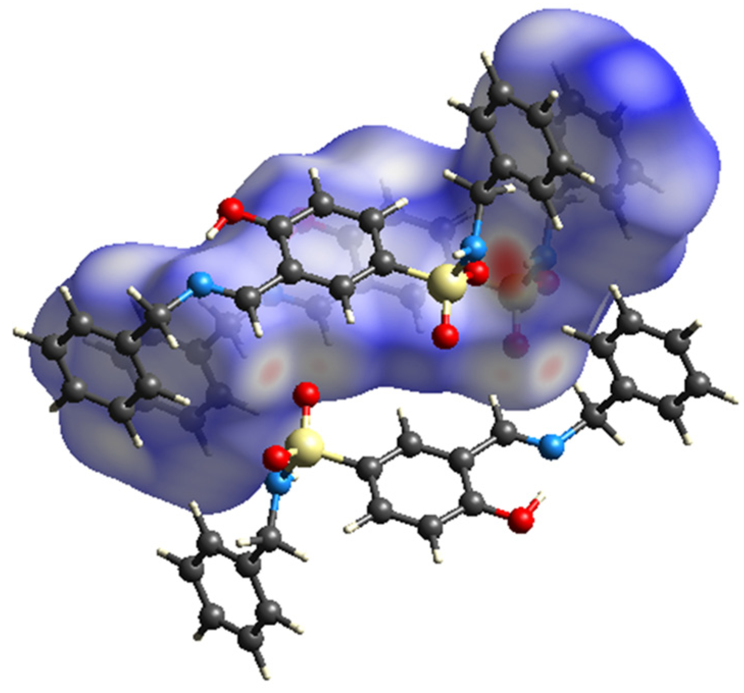 These calculations were performed with CrystalExplorer 21.5 software [17]. The Hirshfeld surfaces (HSs) were mapped as reported [18]. The Hirshfeld surfaces (HSs) [19], intermolecular interactions, and their reciprocal fingerprints [18,20] were determined as reported [21]. The energy components were calculated using the Gaussian 09 software [22] at the B3LYP/6-31G (d,p) theory, after applying the scale factors [23], the % contribution of the individual components to the stabilization energy was calculated. The energy distribution in the crystal network was depicted as frameworks [20,24] of Eelect, Edisp, and Etot in a 23 unit cells, and a 5.0 Å radius, with a tube size of 150 kJ mol−1, and a cut-off value of 10 kJ mol−1.