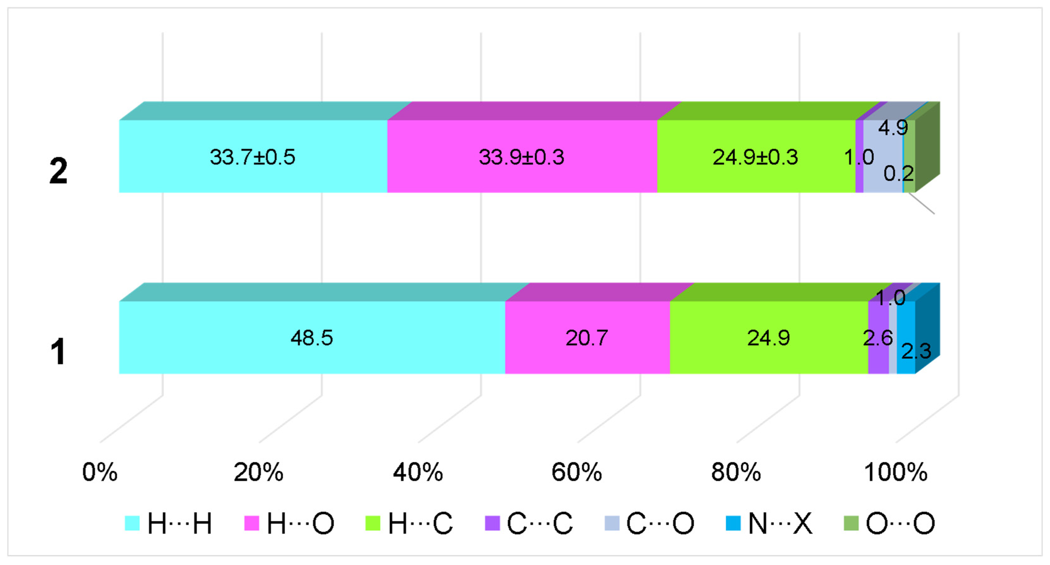 The Hirshfeld surfaces (HSs) of compounds 1 and 2 are shown in Figure 6 and Figure 7. Distances shorter than the sum of the vdw radii are depicted as red areas in the HSs. The observed red bright spots correspond to N–H∙∙∙O and soft C–H∙∙∙O hydrogen bonding, O∙∙∙H/H∙∙∙O interactions (20.7%, 1; 33.9 ± 0.3%, 2), which are the strongest contributors to the individual surfaces. The C–H∙∙∙π, H∙∙∙C/C∙∙∙H contacts (24.9%, 1; 24.9 ± 0.3%, 2), are the second largest contributor to the individual surfaces of 1 and 2. Whereas the H∙∙∙H contacts (48.5%, 1; 33.7 ± 0.5%, 2) are the largest contribution interactions to the individual surfaces. In Figure 8, the contributions of the most significant interactions (%) are depicted.