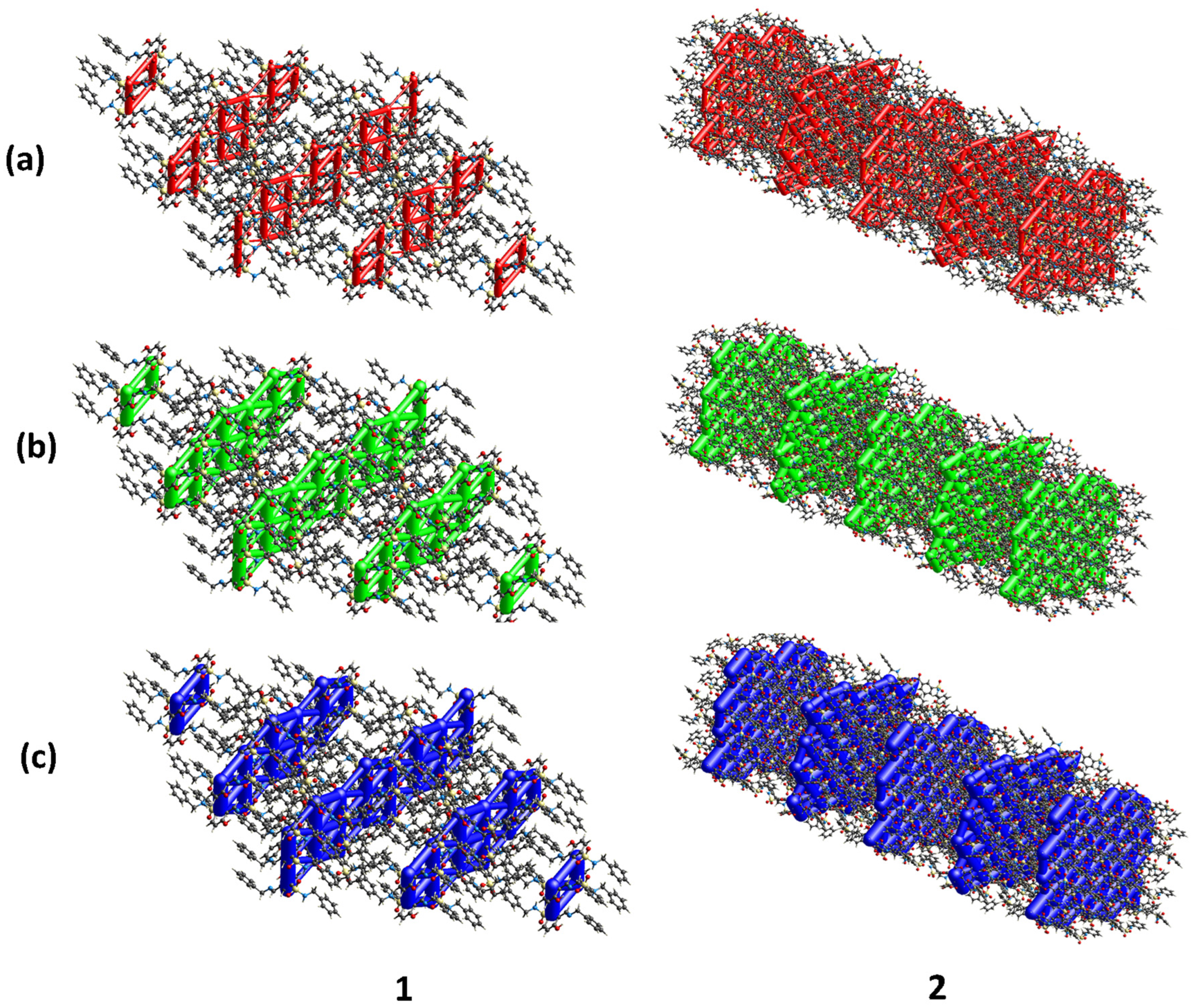 In Figure 9, the energy framework diagrams for Eele (red), Edis (green), and Etot (blue) for a cluster of nearest-neighbor molecules are shown. Cylinders joining the centroids of molecules represent the energies between molecular pairs; the cylinder radius is proportional to the magnitude of the interaction energy.